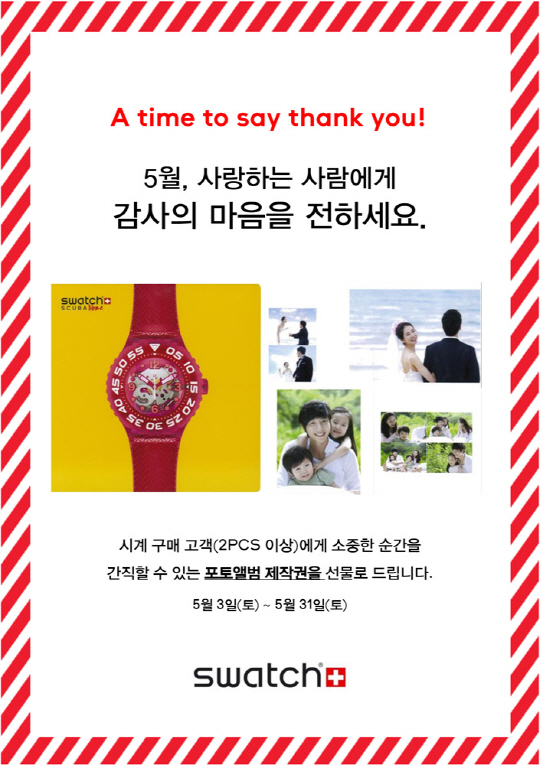 스와치는 각 기념일 별로 추천 제품을 제시하고 구매고객을 대상으로 포토 앨범 제작권을 증정한다. 앨범은 사랑하는 사람들과 함께 나눈 특별한 시간들을 담아 그 순간을 오랫동안 간직할 수 있게 해 주기에 더욱 특별하다. 행사는 5월 3일부터 5월 31일까지 진행한다.
