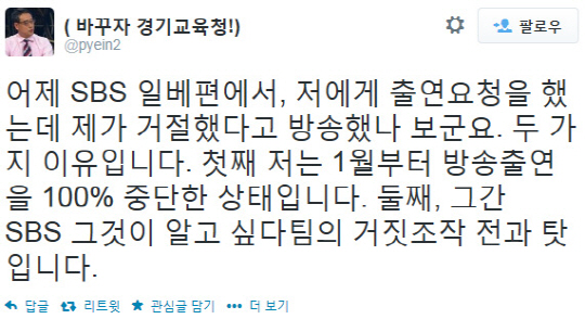4일 변희재는 자신의 트위터에 변희재 대표는 4일 자신의 트위터에 "어제 SBS 일베 편에서 저에게 출연요청을 했는데 제가 거절했다고 방송했나 보군요"라고 말문을 열었다.