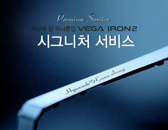 시그니처 서비스란 베가 아이언의 메탈 소재를 활용한 프리미엄 서비스이다. 견고하고 고급스러운 Endless Metal 부분에 레이저 마킹기로 글자나 기호를 정교하게 각인시킨다. 각인할 내용, 위치, 서체, 색상까지 소비자가 원하는 대로 선택할 수 있어 자신만의 개성을 표현할 수 있다. 이를 통해 소비자들은 세상에 단 하나뿐인 나만의 베가 아이언2를 소장할 수 있게 된다. 최근 소비자들이 자신이 보유한 명품 제품에 스스로 각인을 새겨 명품으로서의 특별함을 부여하는 경우가 많아지는 추세다. 해외 유수의 명품 브랜드 시계, 지갑, 구두 등 최고급의 가치를 지닌 제품에 자신만의 사적인 메시지를 담음으로써 세상에서 단 하나뿐인 나만의 것이라는 특별한 의미와 자부심을 더하기 위해 각인을 한다.
