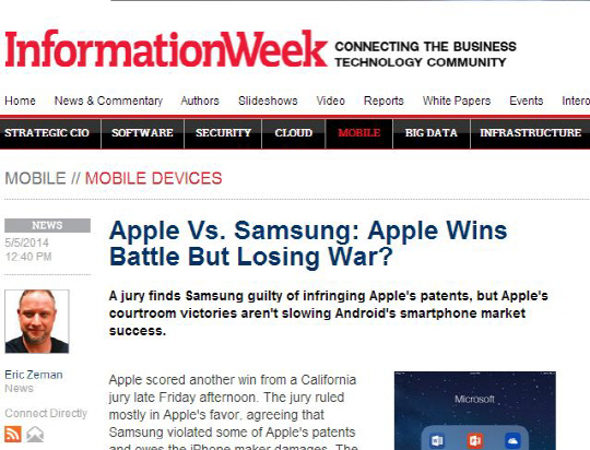 IT 정보기술 주간지 인포메이션위크는 애플이 형식적으로 삼성전자를 상대로 소송을 했지만 실제로는 구글의 안드로이드 기본 기능들을 타깃으로 하고 있다는 점을 지적하면서 애플의 의도와는 달리 구글의 입지가 오히려 강화됐다고 분석했다.