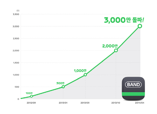 SNS 기반 커뮤니티 밴드의 다운로드 누적수가 4월 말 기준, 3000만건을 돌파했다. 2012년 8월 서비스 출시 이후 2년이 채 되지 않아 거둔 쾌거다. 특히 밴드 전체 이용자 중 70%는 기존 밴드 이용자들로부터 초대를 통해 가입한 것으로 실제 사용한 이용자들의 추천으로 성장하고 있어, 3,000만 다운로드 돌파가 더욱 의미 깊다는 게 업계의 분석이다.