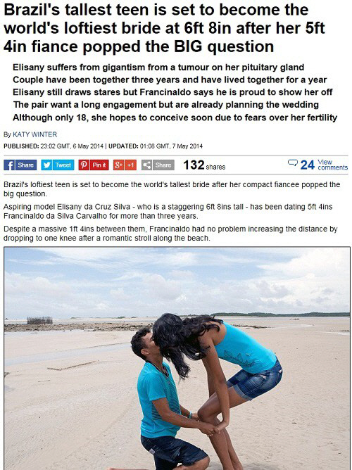 특히 엘리자니와 지난 3년 간 교제해 온 남자친구인 프란치날도 다 실바 카발로의 키는 162.5㎝의 단신으로, 두 사람의 키 차이는 무려 50cm에 달한다.