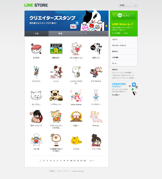 '라인 크리에이터스 마켓'은 전 세계 라인 이용자들이 라인 스티커를 제작해 판매할 수 있는 플랫폼. 지난 4월 17일 '라인 크리에이터스 마켓'https://creator.line.me에서 등록 접수를 시작한 이래, 전세계에서 약 30,000 명이 넘는 이용자들이 크리에이터(스티커 제작자)로 등록했으며, 등록 신청된 스티커는 5,000 세트가 넘는다.