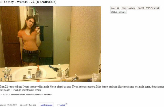 그는 자신의 사진과 함께 '나와 함께 놀 숫컷 말을 구한다. 무엇인가 함께 한 후 돌려 줄 것이니 가능한 사람은 연락달라'는 글을 게시판에 남겼다.