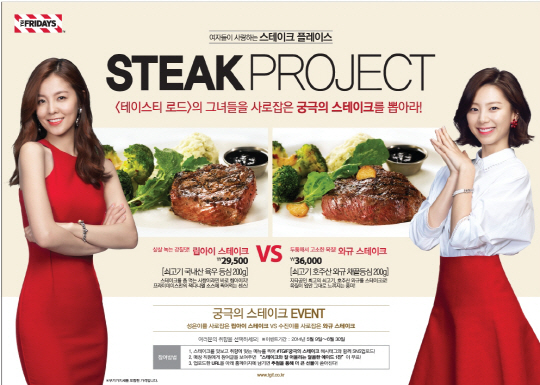 이번 TGI프라이데이스의 광고는 '스테이크 프로젝트'를 주제로 국내 FR업계 최초 호주산 와규 채끝등심 스테이크와 국내산 육우를 활용한 '립아이 스테이크'로 각각 제품별 배우 박수진, 김성은이 모델로 활동한다.