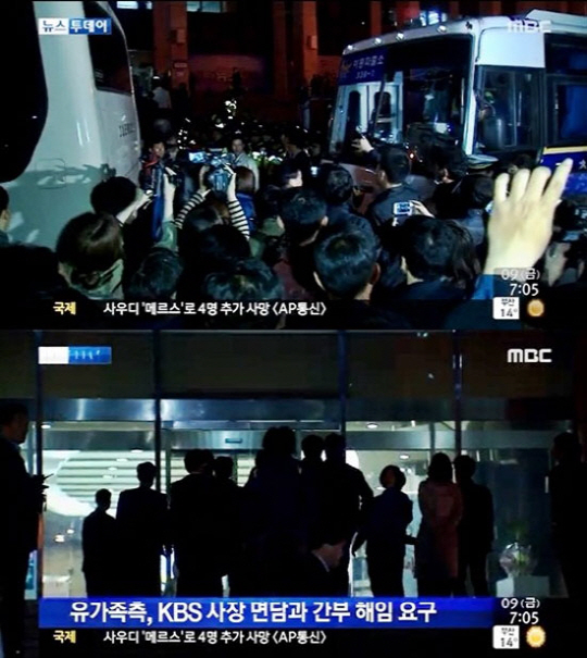 이에 대해 유족들의 항의가 이어지자 KBS 간부 2명이 이날 오후 합동분향소를 찾아 조문하고 사과하려했으나, 유족들은 버스를 타고 KBS 본관 앞에 집결한 것이다.