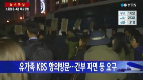 이들은 희생자들의 영정을 품에 안고 "KBS 국장이 세월호 희생자수와 교통사고 사망자수를 비교하는 망언을 했다"면서 해당 간부의 파면과 사장의 공개 사과 등을 요구했다. 이 과정에서 항의 방문을 가로막는 경찰과 4시간가량 맞서며 실랑이를 벌였으며, 유족들은 KBS 사장과의 직접 면담이 불발되자 대통령이 나서 해결해 달라며 청와대 인근에서 밤새 집회를 이어갔다.
