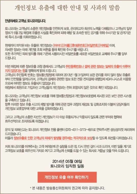 토니모리측은 "고객의 일부 정보가 5월2일 해킹에 의해 유출된 사실을 확인해 피해예방과 조속한 범인 검거를 위해 수사기관과 관계기관에 조치했다. 관련 정보가 유통되거나 악용되지 않도록 관련 부처와 협력할 것"이라며 "정보통신망법에 의해 보관 관리하지 않아 주민번호와 결제 관련 정보는 유출되지 않았다. 정보유출로 피해가 발생하면 적극적으로 보상할 수 있도록 최선을 다하겠다"고 밝혔다.