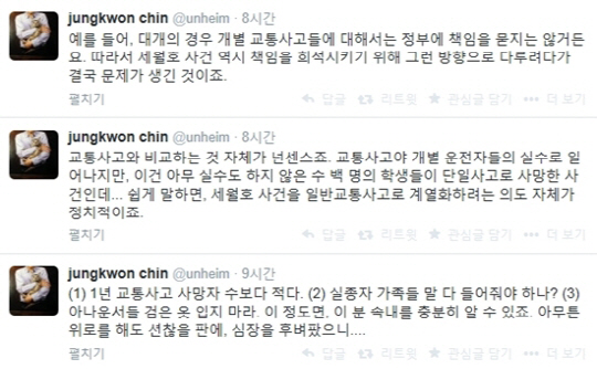 이어 그는 "대개의 경우 개별 교통사고들에 대해서는 정부에 책임을 묻지는 않거든요. 따라서 세월호 사건 역시 책임을 희석시키기 위해 그런 방향으로 다루려다가 결국 유가족들의 심장을 후벼파고 분노를 일으킨 것이죠"라고 덧붙였다.