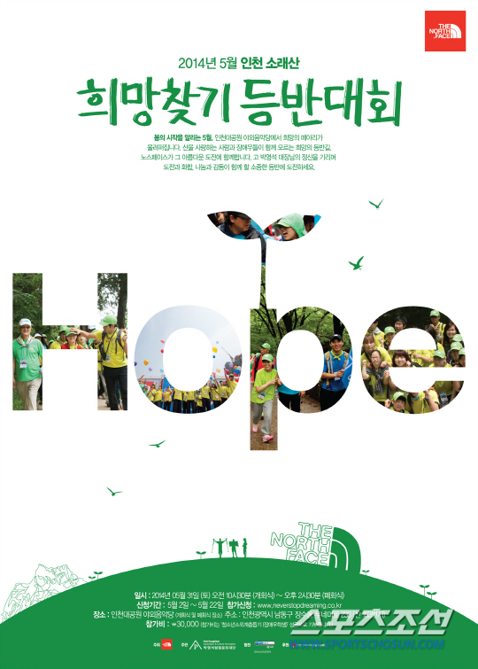노스페이스는 오는 31일 인천 소래산 일원에서 개최되는 '2014 노스페이스 희망찾기 등반대회' 참가자를 22일까지 모집한다.