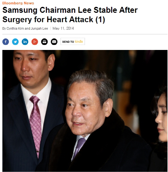 블룸버그 통신과 로이터 통신도 "이건희 회장이 호흡곤란 증세를 호소한 뒤 응급실에서 급성 심근경색 진단을 받고 시술을 받았다"면서 이건희 회장이 1999년 폐암 수술을 받은 병력을 자세하게 소개했다.