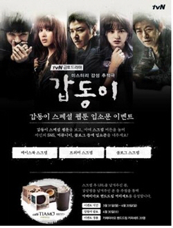 젤라또&커피전문점 '카페띠아모'는 케이블채널 tvN 금토드라마 '갑동이'를 협찬중이다. 드라마의 주인공인 윤상현, 이준, 김지원 등의 촬영장소가 카페띠아모 송도점이다. 갑동이는 가상의 도시인 일탄에서 벌어진 연쇄살인사건을 배경으로 한 20부작 미스터리 감성 추적극이다. 진지한 모습으로 돌아온 성동일과 윤상현, 김민정, 이준 등 굵직한 배우들의 캐릭터 변신이 화제가 되고 있다. 케이블 채널로는 드물게 2%에 육박하는 시청률을 기록하고 있다.