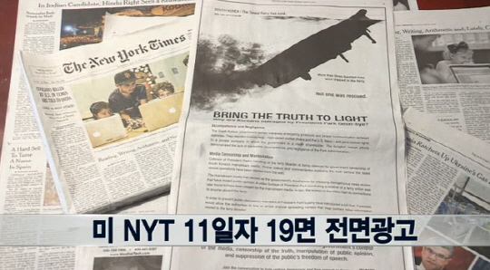 11일(현지시간) 미국 일간지 뉴욕타임스(NYT)에는 "진실을 밝히라" 는 제목으로 '박근혜 정부'를 비판하는 전면광고가 실렸다.