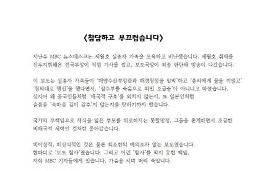 비이성적, 비상식적인 것은 물론 최소한의 예의조차 없는 보도였습니다. 한마디로 '보도 참사'였습니다. 그리고 이런 '참사'를 막지 못한 책임, 저희 MBC 기자들에게 있습니다. 가슴을 치며 머리 숙입니다.
