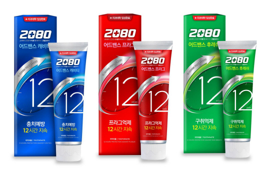 양치 후 충치예방, 프라그 및 구취억제 효과가 12시간 지속되는 것이 특징으로 치과대학 임상실험을 통해 입증 받았다. 특허 출원한 자작나무 껍질 추출물을 함유해 천연 항균성분 작용으로 입안의 상쾌함과 개운함을 주는 게 특징. 2080 어드밴스 캐비티 치약은 충치예방에 강력한 효능을 소구한 치약이다. 실리카와 불소의 효과적인 이중케어로 유효성분의 잔류성을 강화시켜 충치균의 증가를 억제해준다. 특히 주성분으로 함유된 불소이온이 막을 형성해 충치를 유발하는 산성 성분으로부터 치아를 보호한다. 2080 어드밴스 프라그 치약은 치아와 잇몸 사이에 쌓여 치석을 발생시키는 프라그 증가를 억제한다. 탄산칼슘과 불소를 통한 프라그 억제효과로 구강 내 염증 유발원인을 근본적으로 해결해 치아를 더욱 깨끗하고 건강하게 유지시켜 준다. 2080 어드밴스 후레쉬 치약은 상쾌한 페퍼민트 향으로 입안의 개운함을 지속시켜 구취농도가 높아지는 것을 억제한다. 함유된 비타민E가 입냄새를 유발하는 잇몸질환을 예방하고 실리카 성분이 치면 세균막을 제거해 구취를 집중케어할 수 있다.