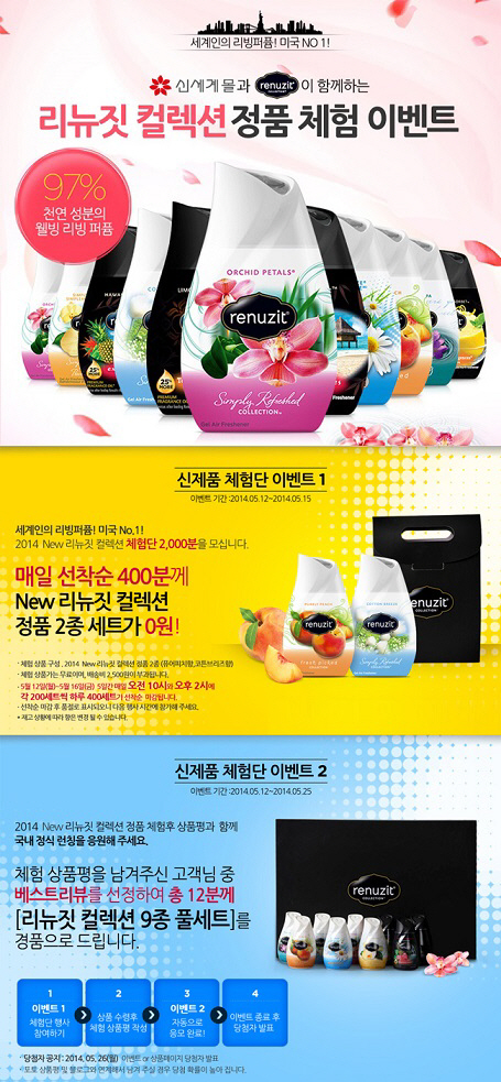 신세계몰 고객 감사 이벤트는 미국 방향제 시장 점유율 1위를 차지하고 있는 리빙 퍼퓸 '리뉴짓 컬렉션' 입점을 기념해 제품을 직접 체험할 수 있는 기회를 제공하고자 마련됐다. 12일부터 16일까지 매일 선착순 400명이 배송비 2500원만 내면 '리뉴짓 컬렉션' 정품 2종을 무료로 체험할 수 있다. 체험 이벤트에 당첨돼 제품을 사용한 뒤 상품평을 올리는 소비자들 중 선정된 12명에게는 '리뉴짓 컬렉션' 9개 전 종을 경품으로 증정한다. 상품평 작성 이벤트는 5월 25일까지 진행되며 당첨자는 26일 신세계몰 이벤트 혹은 상품페이지에서 확인할 수 있다.
