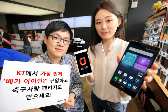 KT(회장 황창규)가 팬택의 플래그십 모델인 '베가 아이언2'를 12일 출시, 가입 고객 중 총 5천명을 추첨해 '축구 사랑' 패키지 3종을 증정하며, 올레닷컴에서 구매한 선착순 2백명에게 '축구 사랑' 패키지와 야구입장권을 2매를 증정하는 이벤트를 실시한다.