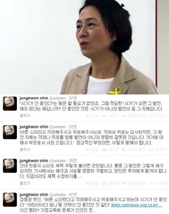 한편 정몽준 부인 발언에 대해 진중권의 일침에 많은 네티즌들은 "정몽준 부인 발언, 요목조목 따지는 진중권 일리 있다", "정몽준 부인 발언, 진중권의 발언의 질 동감한다", "정몽준 부인 발언, 많은 사람의 오해가 풀어지길", "정몽준 부인 발언, 정몽준 또 한번 사죄하고 해명하는 일이 됐다", "정몽준 부인 발언, 좀 더 신중했으면 좋았을텐데"등의 반응을 보이고 있다. <스포츠조선닷컴>