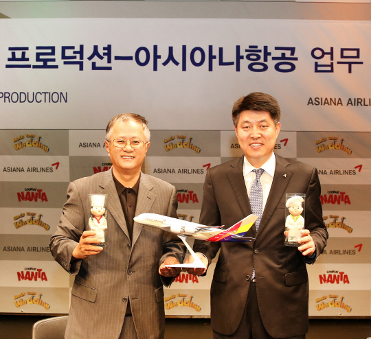 송승환 PMC 프러덕션 회장(왼쪽)과 송석원 아시아나항공 여객마케팅 상무(오른쪽)가 12일(월) 서울 충정로 난타전용극장에서 업무 제휴협약을 체결하며 기념촬영을 하고 있다.