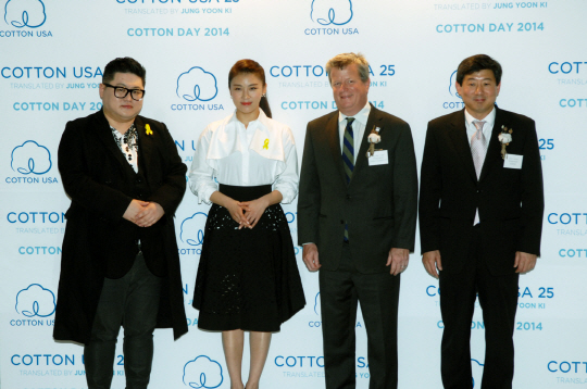 미국면화협회 조던 리(오른쪽 두번째) 사장과 대한방직협회 김준(오른쪽) 회장 등이 참석한 '코튼데이 2014'가 성황리에 개최됐다. 이날 행사엔 스타일리스트 정윤기(왼쪽)가 패션쇼를 진행했고, 하지원이 코튼데이 홍보대사로 임명됐다. 사진제공=미국면화협회