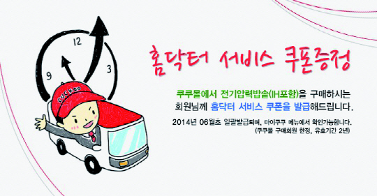 건강생활가전기업 쿠쿠전자(대표 구본학, www.cuckoo.co.kr)가 5월 한달 동안 공식쇼핑몰 쿠쿠몰에서 전기압력밥솥을 구매한 고객을 대상으로 '홈닥터 서비스' 이벤트를 시행한다.