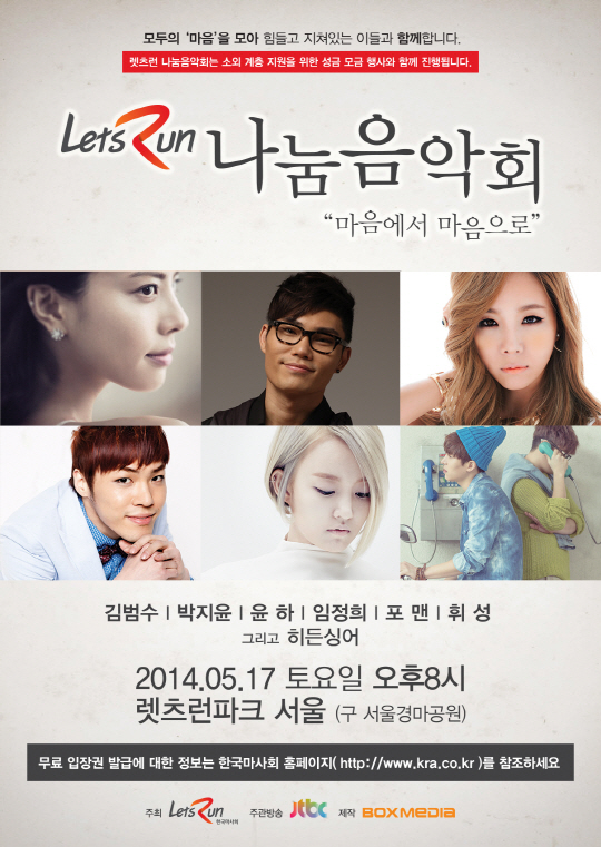국내 정상급 가수들이 오는 17일 오후 8시 렛츠런파크 서울에 모인다. 한국마사회(회장 현명관)가 주최하는 렛츠런 나눔 음악회(마음에서 마음으로)는 예기치 않은 사고로 모두가 지쳐있는 지금 따뜻한 음악으로 위로와 공감을 전하고자 기획됐다. 김범수, 휘성, 윤하, 박지윤, 포맨 등 내로라하는 스타들이 행사 취지에 동감해 출연을 결정했다.