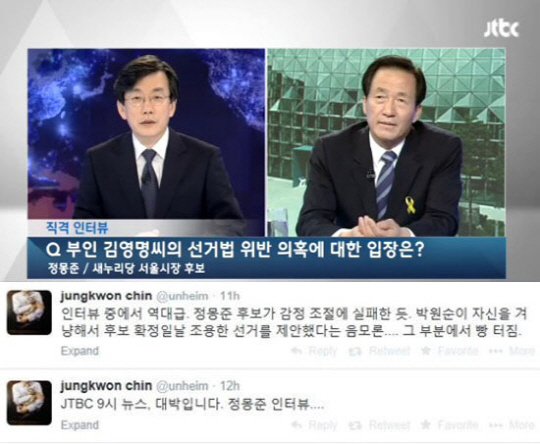 12일 진중권 교수는 트위터에 "JTBC 9시 뉴스, 대박입니다. 정몽준 인터뷰…"라는 짧은 글에 이어 "인터뷰 중에서 역대급. 정몽준 후보가 감정 조절에 실패한 듯. 박원순이 자신을 겨냥해서 후보 확정일 날 조용한 선거를 제안했다는 음모론. 그 부분에서 빵 터짐"이라고 적었다.