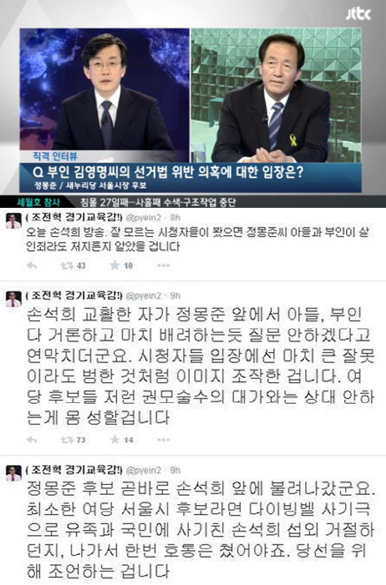 앞서 12일 오후 방송된 JTBC '뉴스9'에서는 이날 새누리당 서울시장 후보로 최종 확정된 정몽준 의원과 손석희 앵커가 화상을 통해 인터뷰를 나눴다.