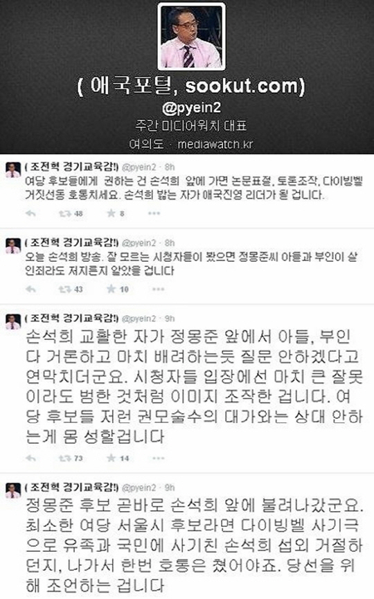 변희재 손석희 정몽준 아들, 변희재 지금 정몽준 아들 두둔하나?", "