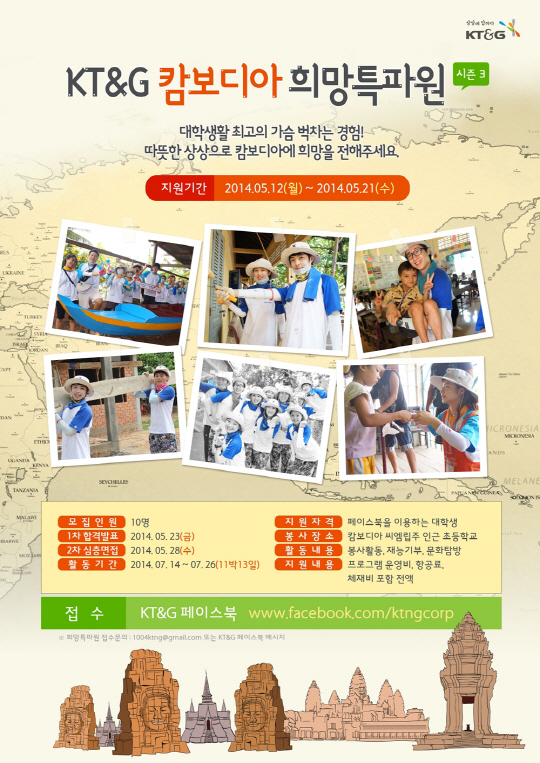 KT&G는 오는 21일까지 전국 대학생을 대상으로 캄보디아 현지에서 봉사활동을 진행할 '캄보디아 희망특파원' 3기를 모집한다.