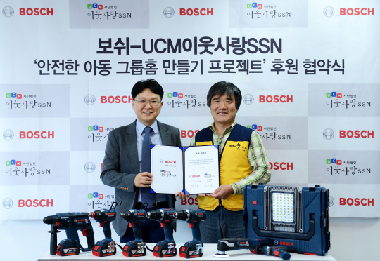 한국로버트보쉬 전동공구사업부(대표 박진홍)가 지난 13일 경기도 용인의 보쉬 본사에서 자원봉사 인증센터 'UCM 이웃사랑 SSN(이하 UCM 이웃사랑)'과 안전한 아동 그룹홈 만들기 후원을 위한 업무 협약(MOU)을 체결했다.