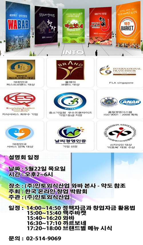 설명회는 5월22일 목요일 2~6시까지 진행되며 장소는 (주)인토외식산업 본사 (5호선 길동역1번출구) 에서 진행되며 전화문의 02-514-9069 또는 한국온라인창업박람회 http://cafe.naver.com/w3m/126750 또는 와바 홈페이지를 http://www.wabar.co.kr/ 참조 하면 된다.