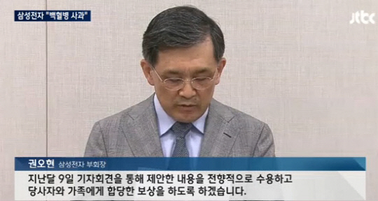 14일 권오현 대표이사(부회장)는 삼성전자 서초사옥에서 열린 기자회견에서 "우리 사업장에서 일하던 직원들이 백혈병 등 난치병에 걸려 투병하고 있고, 일부는 세상을 떠났다"며 "이 분들과 가족의 아픔·어려움에 대해 저희가 소홀한 부분이 있었다. 진작 이 문제를 해결했어야 하는데 그렇지 못한 점을 마음 아프게 생각하며 이 자리를 빌려 진심으로 사과한다"고 말했다.