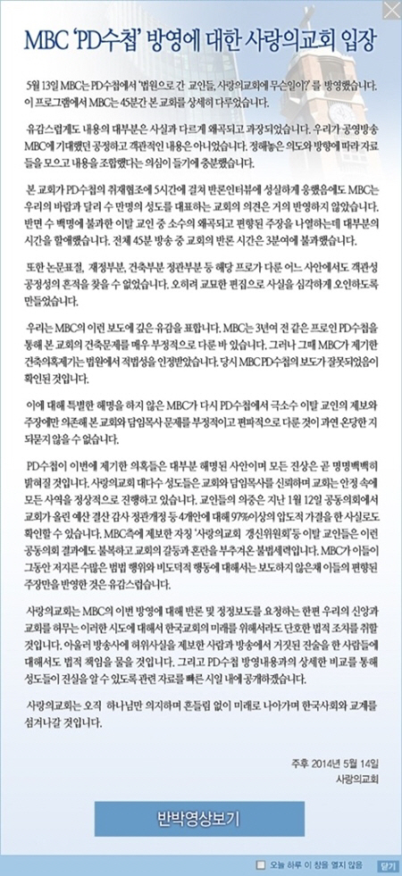 이에 교회 측은 "MBC가 다시 PD 수첩에서 극소수 이탈 교인의 제보와 주장에만 의존해 본 교회와 담임 목사 문제를 부정적이고 편파적으로 다룬 것이 온당한 지 되 묻지 않을 수 없다"며 "이번에 PD 수첩이 제기한 의혹들은 대부분 해명된 사안이며 모든 진상은 곧 명명백백히 밝혀질 것"이라고 강조했다.