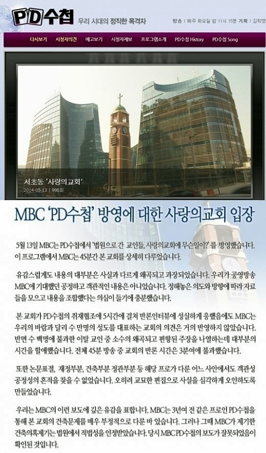 지난 13일 오후 방송된 MBC 시사교양프로그램 'PD수첩'에서는 '서초동 사랑의 교회' 편이 전파를 탔다.