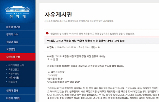 또 전교조는 교육부가 청와대 게시판에 실명으로 박근혜 대통령 퇴진 운동을 선언한 글을 쓴 교사 43명에 대한 징계를 검토 중인 사실에 대해 "정당한 요구에 징계조치가 이뤄지면 국민의 분노를 살 것"이라며 법률적으로 대응하겠다는 입장을 밝혔다.