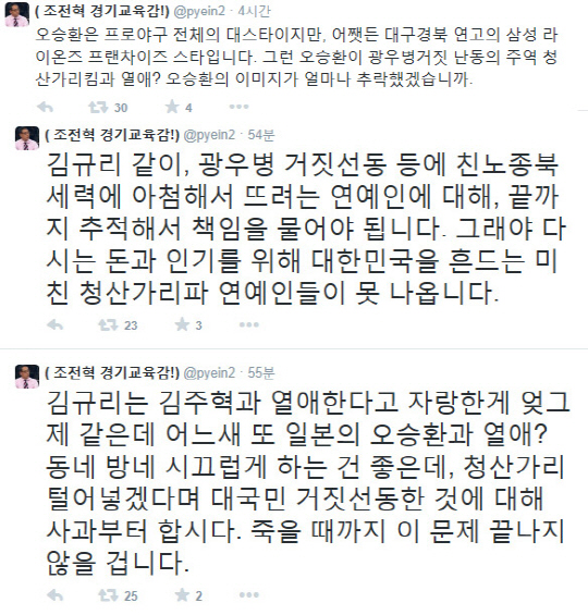 이어 "김규리 같이, 광우병 거짓선동 등에 친노종북 세력에 아첨해서 뜨려는 연예인에 대해, 끝까지 추적해서 책임을 물어야 됩니다. 그래야 다시는 돈과 인기를 위해 대한민국을 흔드는 미친 청산가리파 연예인들이 못 나옵니다"라고 덧붙였다.