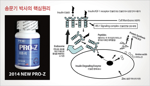 프로지에는 이러한 기능과 아연의 흡수율을 최적화 시켜주는 CPH(cyclo-his-pro, 체내효소) 아연 합성물질이 포함이 되어있어 세포네 인슐린저항성을 정상적으로 유지시키는 역할을 한다. 송문기 박사가 개발한 신합성물질은 우리 인체에 아연의 흡수를 최적화 시켜주므로 IDE(Insulin Degrading Enzyme, 인슐린분해효소) 인슐린 분해 효소의 촉매작용을 도와 인슐린 저항성을 정상적으로 유지 할수 있도록 도움을 준다.