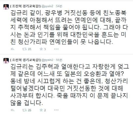 이어 그는 "김규리 같이, 광우병 거짓선동 등에 친노 종북 세력에 아첨해서 뜨려는 연예인에 대해 끝까지 추적해서 책임을 물어야 된다"며 "그래야 다시는 돈과 인기를 위해 대한민국을 흔드는 미친 청산가리파 연예인들이 못 나옵니다"라고 지적했다.