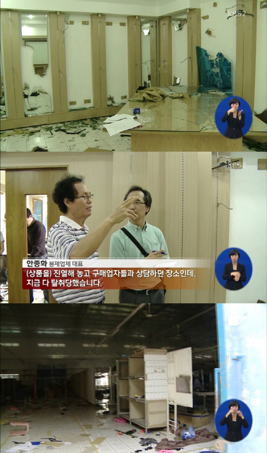 베트남 현지서 봉제업체를 운영하고 있는 안종화 대표는 "상품을 진열해놓고 구매업자들과 상담하던 장소인데 지금 다 털렸다"면서 베트남 시위대에게 물건이 탈취 당한 사무실과 깨진 집기 등을 공개했다.