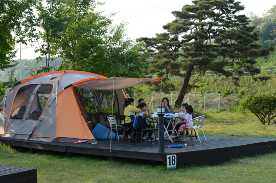 플랜테이션에서 글램핑을 즐기는 가족의 모습.