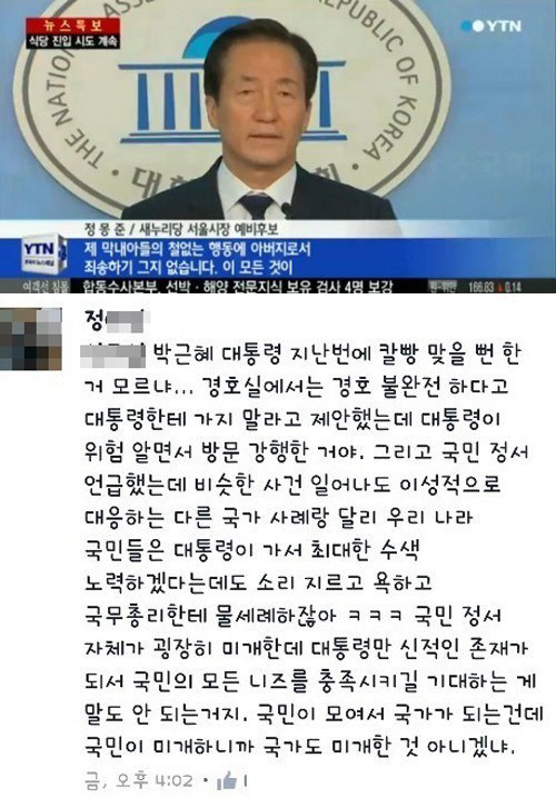 앞서 지난 달 18일 정몽준 막내아들은 자신의 페이스북에 "대통령에 소리 지르고 욕하고 국무총리한테 물세례 하잖아"라며 "국민이 미개하니까 국가도 미개한 것 아니겠느냐"는 글을 게재해 파문이 일었다.