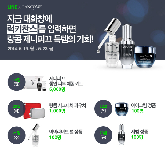 글로벌 메신저 라인이 세계적인 화장품 브랜드 랑콤과 함께 두번째 'LINE 럭키찬스' 를 19일부터 23일까지 진행한다.