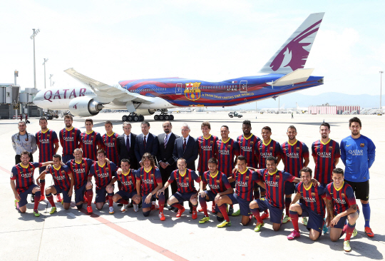 카타르항공이 FC 바르셀로나(바르샤, FCB)와의 파트너쉽을 기념해 제작한 'FC 바르셀로나 래핑 항공기(FCB 래핑 항공기)'가 14일(현지시각) 바르샤의 연고지인 스페인 바르셀로나의 엘프라트 공항(El Prat Airport)에 처음으로 착륙했다.