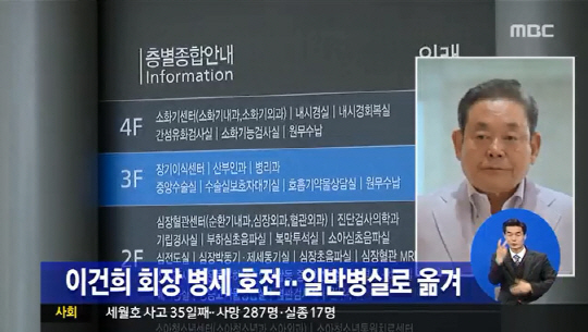급성 심근경색으로 입원해 중환자실에서 치료를 받고 있던 이건희 삼성 회장이 19일 저녁 일반병실로 옮겼다.