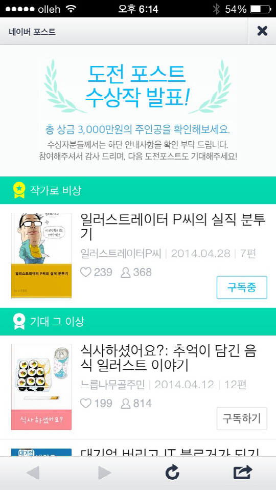 네이버는 모바일 콘텐츠로서의 가능성에 주목하며, 내부 콘텐츠 평가와 독자 인기도를 반영하여 총 49명의 작품을 선발했다. 그 중 정감 있는 일러스트와 글로 솔직하게 자신만의 이야기를 풀어낸 '일러스트레이터 P씨의 실직 분투기'가 1등 수상의 영광을 안았다.