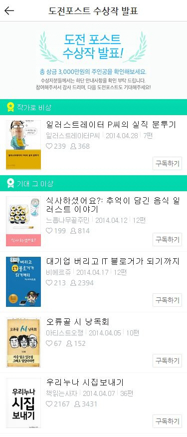 네이버는 모바일 콘텐츠로서의 가능성에 주목하며, 내부 콘텐츠 평가와 독자 인기도를 반영하여 총 49명의 작품을 선발했다. 그 중 정감 있는 일러스트와 글로 솔직하게 자신만의 이야기를 풀어낸 '일러스트레이터 P씨의 실직 분투기'가 1등 수상의 영광을 안았다.