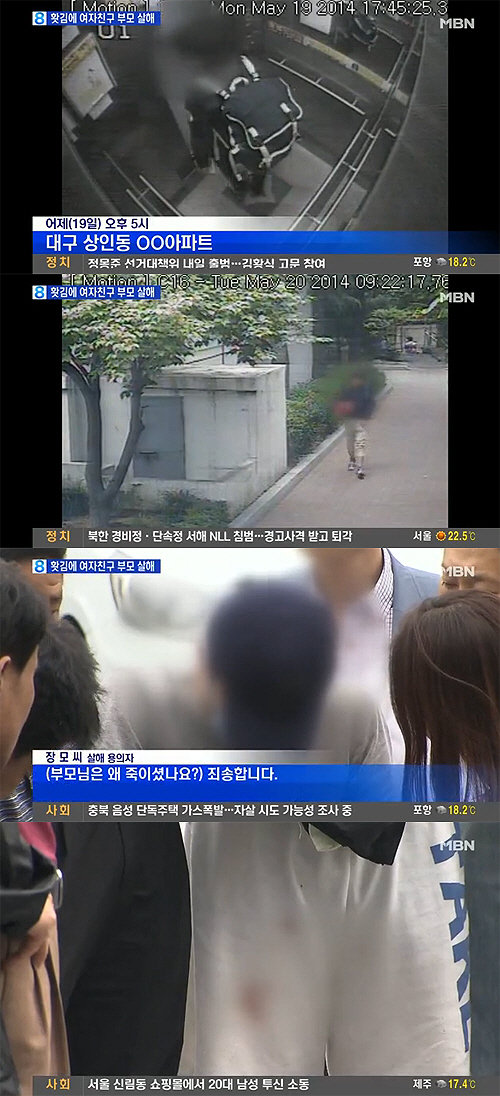 신고를 받고 출동한 경찰은 아파트 폐쇄회로(CCTV)를 분석한 결과 딸 권 씨의 대학교 동아리 선배 장모(24·중퇴) 씨가 이날 오전 9시 18분께 피가 묻은 헝겊으로 손을 감싼 채 밖으로 빠져나오는 모습을 확인했다.