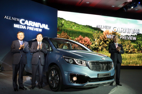 | 기아차가 22일 올 뉴 카니발을 공개했다. 기아차의 이삼웅 사장, 윤선호 기아디자인센터장, 김창식 국내영업본부장(오른쪽부터)이 올 뉴 카니발 옆에서 포즈를 취하고 있다. |