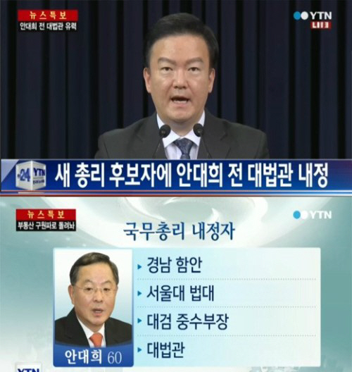 22일 민경욱 청와대 대변인은 브리핑에서 "박 대통령은 대국민담화를 통해 밝힌 대로 세월호 사고를 통해 드러난 우리 사회의 잘못된 관행과 공직사회의 적폐를 척결하고, 새로운 대한민국을 위한 국가개조를 추진하기위해 오늘 안대희 전 대법관을 새 국무총리를 내정했다"고 밝혔다.